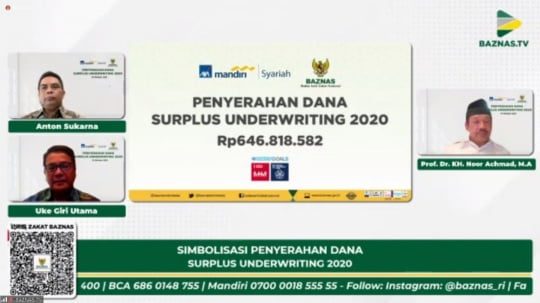 Penyerahan sebagian dana surplus underwriting secara simbolis diserahkan oleh Direktur AXA Mandiri Financial Services Uke Giri Utama kepada Ketua Baznas RI Noor Achmad yang diselenggarakan secara virtual dan live melalui kanal YouTube BaznasTV, Selasa (19/10/2021).